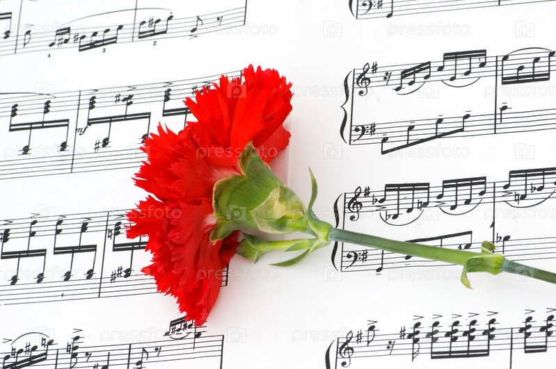 Красная гвоздика на нотных листах крупным планом