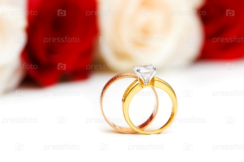 Золотые кольца и розы изолированы на белом