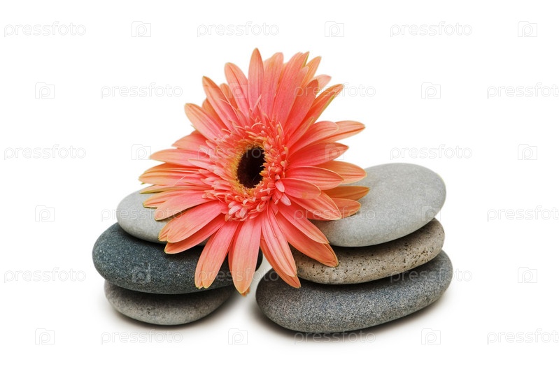 Розовый цветок герберы на стопках камней на белом фоне