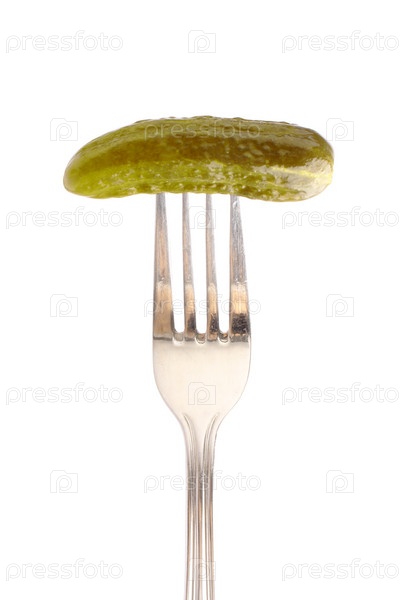 Маринованный огурец на вилке на белом фоне