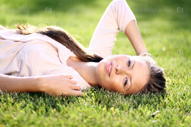 Симпатичная молодая девушка лежит на траве