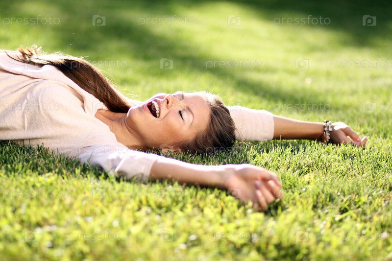 Девушка потягивается, лежа на траве