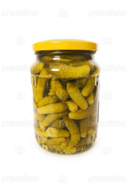 Консервы из огурцов, выделенных на белом