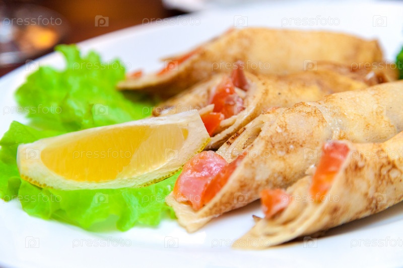 Блинчики с лососем, салат и лимон