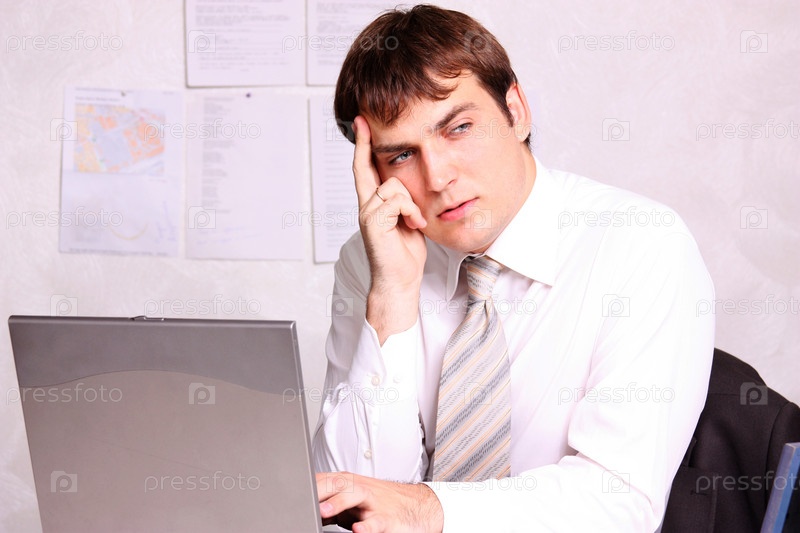 Бизнесмен думает у компьютера