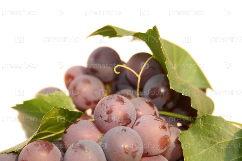 Розовый виноград с листьями крупным планом на белом фоне