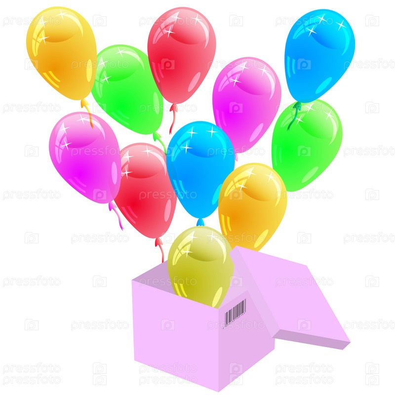 Глянцевые разноцветные воздушные шары вылетают из картонной коробки. Векторная иллюстрация