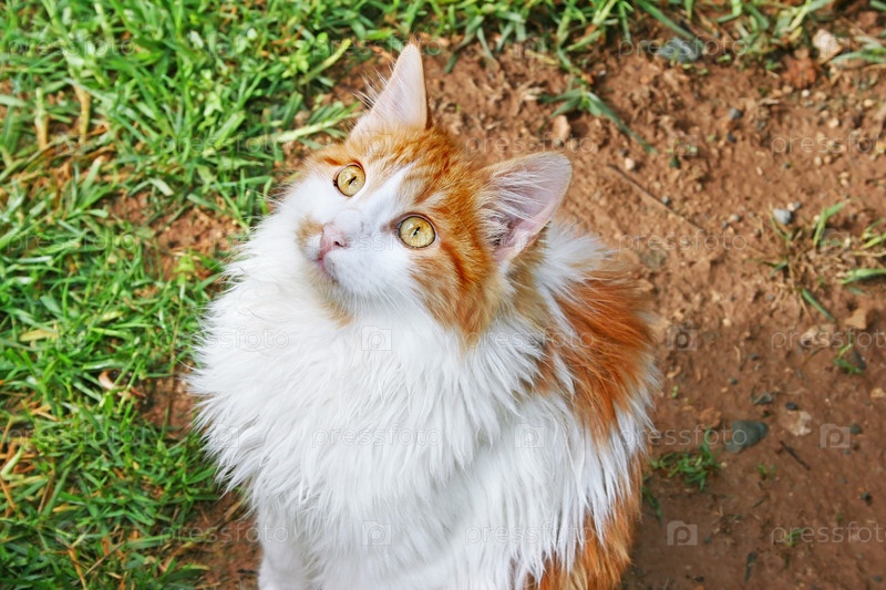 Бело-рыжий кот на траве
