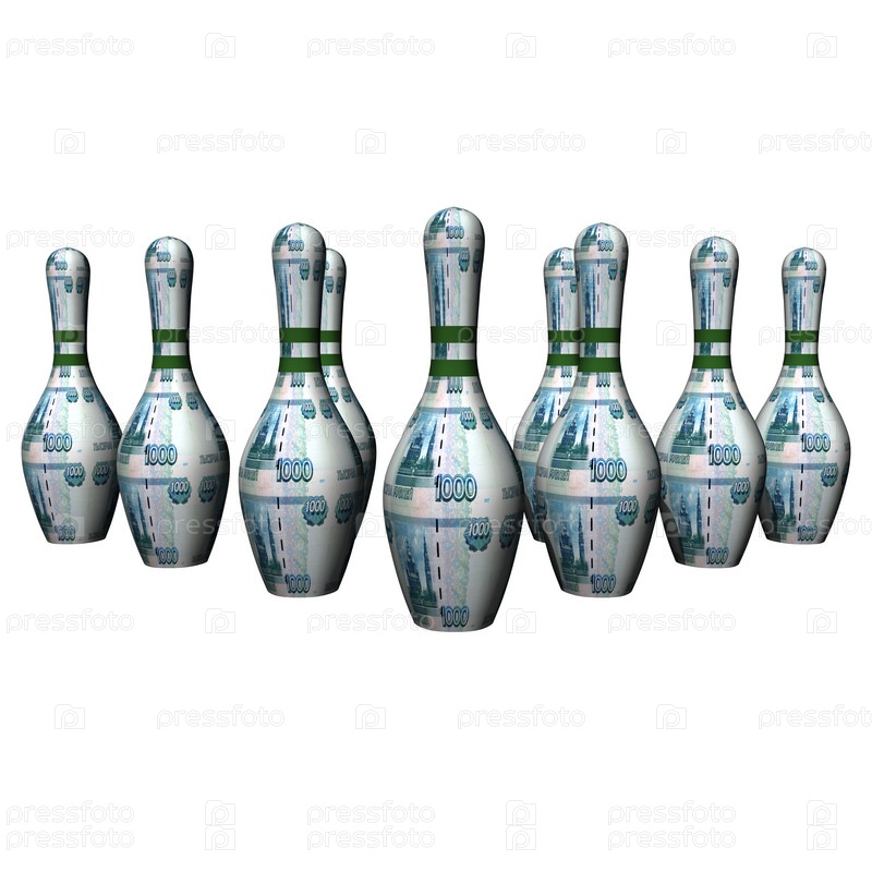 1000-рублевые кегли для боулинга на белом фоне