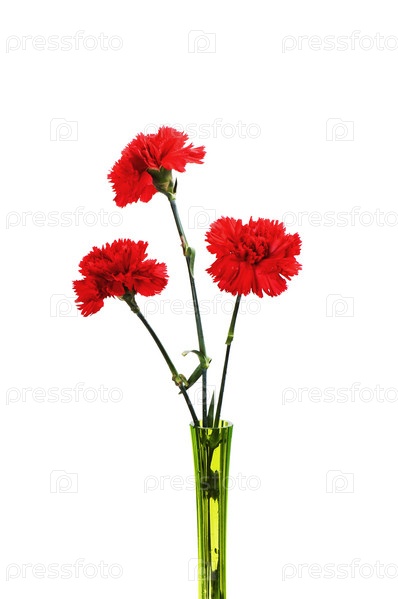Три красных гвоздики в зеленой вазе на белом фоне