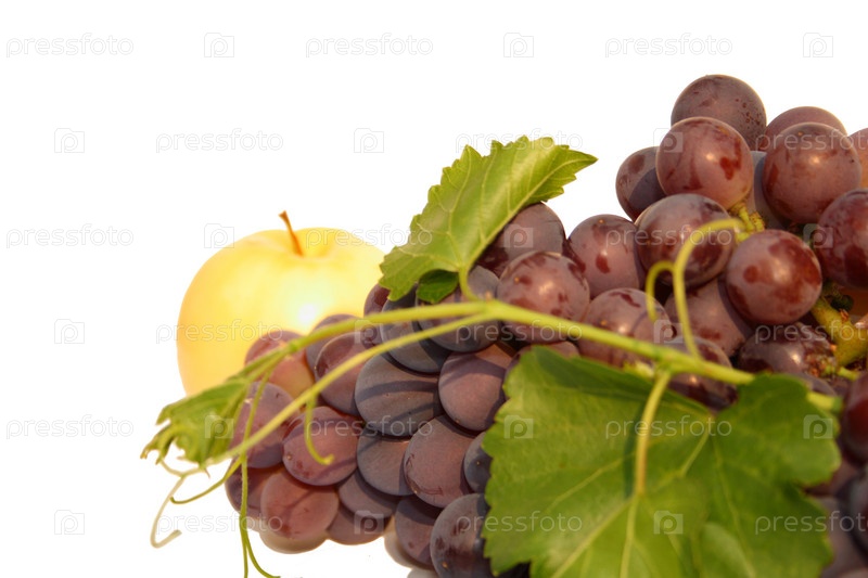 Гроздь винограда и яблоко на белом фоне