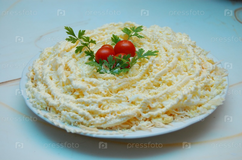Салат "Белочка", украшенный помидорами черри и петрушкой