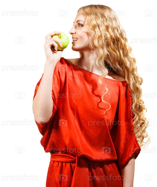 Женщина в красном держит яблоко в руке