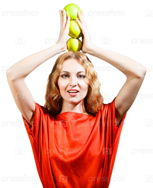 Женщина в красном держит в руках яблоки