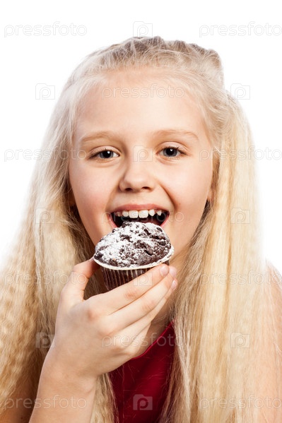 Девочка ест на шоколадные кексы