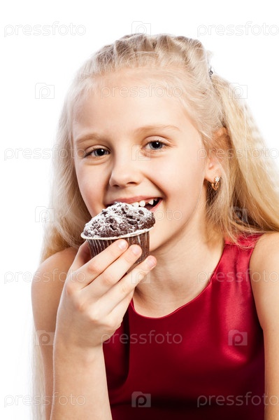 Девочка ест на шоколадные кексы