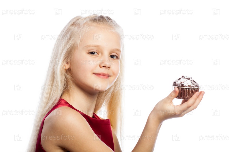 Девочка держит кекс и смотрит в камеру