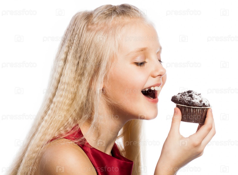 Девочка ест на шоколадные кексы