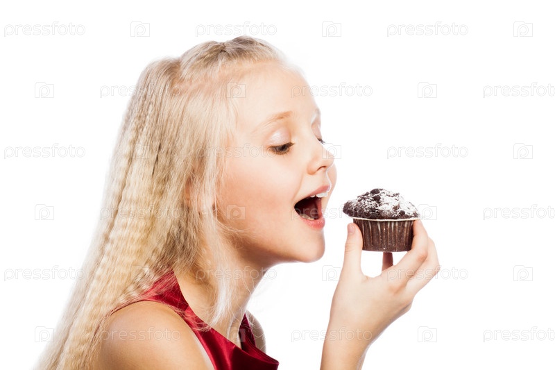 Девочка кусает шоколадный кекс