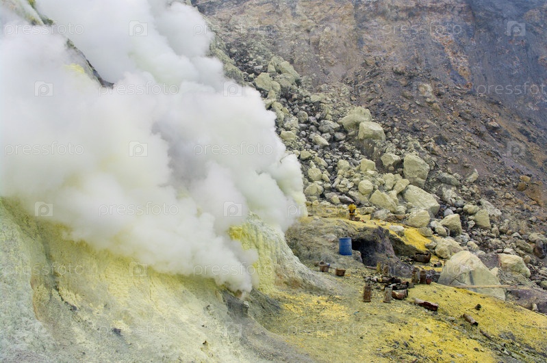 Добыча серы внутри кратера Кавах Льен, Индонезия