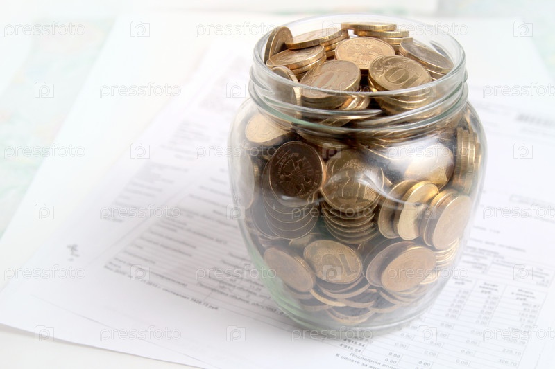 Российские рубли в стеклянной банке, накопление и экономия денег