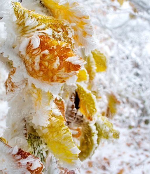 Красочные листья дерева, покрытые снегом