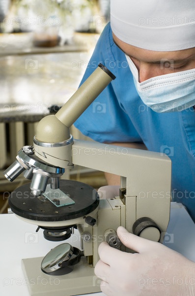 Врач или ученый исследует что-то через микроскоп