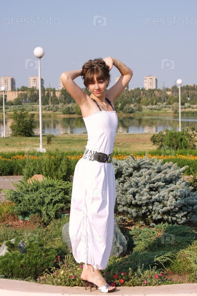 Привлекательная девушка в белой одежде возле цветочной клумбы
