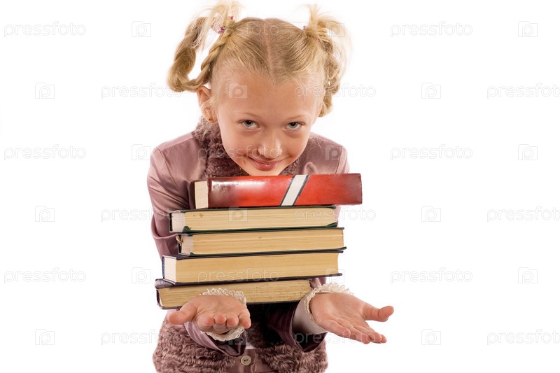 Девочка школьного возраста со стопкой книг в руках на белом фоне