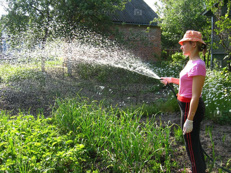 Девушка поливает огород