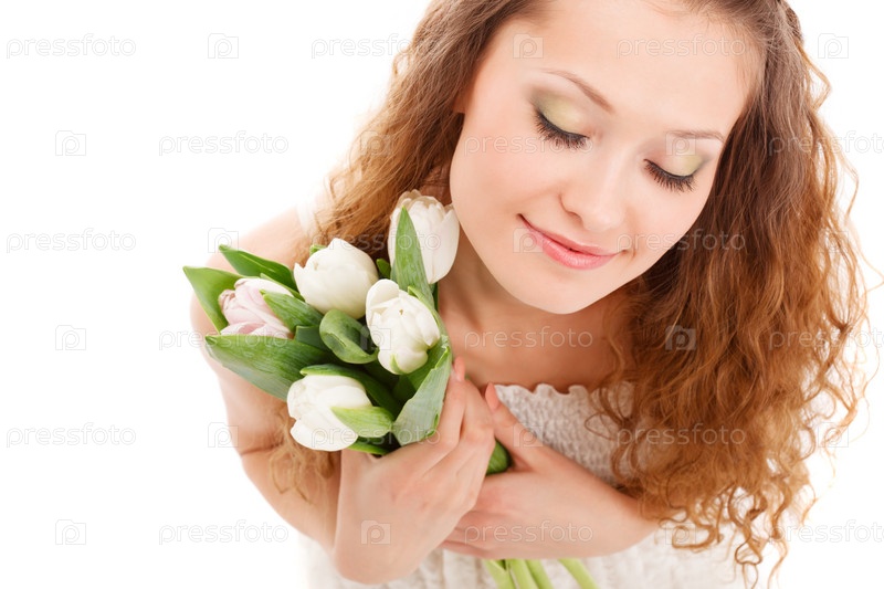 Счастливая женщина держит белые тюльпаны
