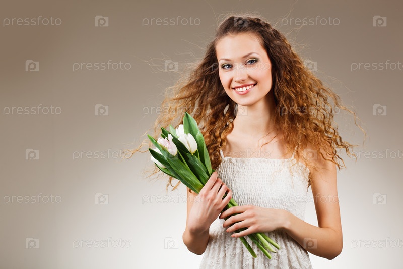 Счастливая женщина держит белые тюльпаны