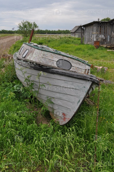 Старый катер на окраине деревни в дельте Северной Двины