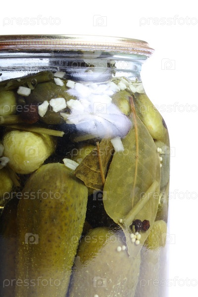 Соленые огурцы в банке на белом фоне
