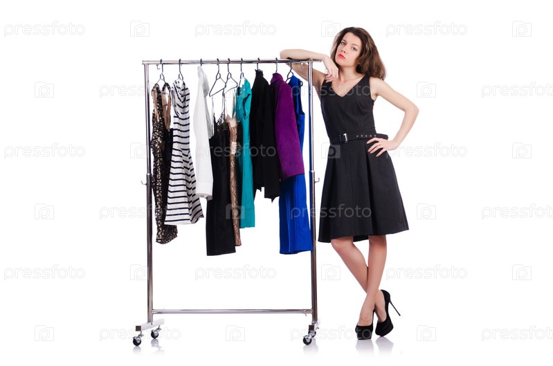 Женщина меряет новую одежду на белом фоне