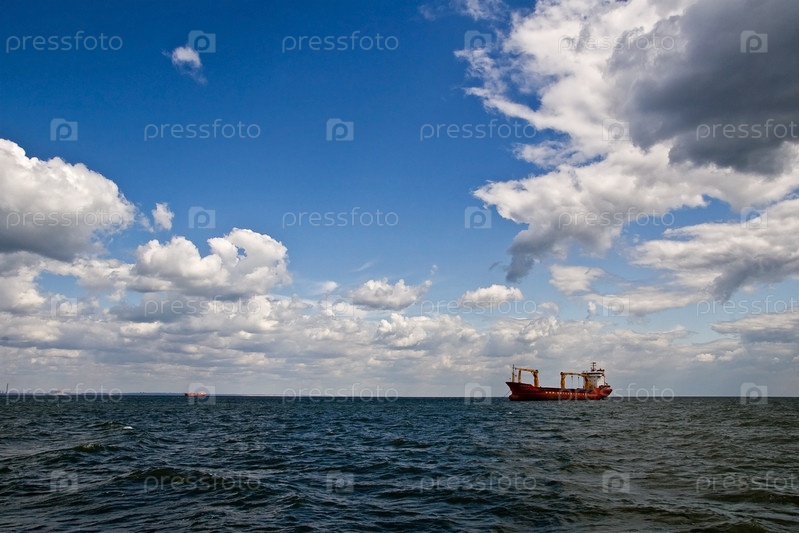 Грузовое судно в открытом море под голубым небом