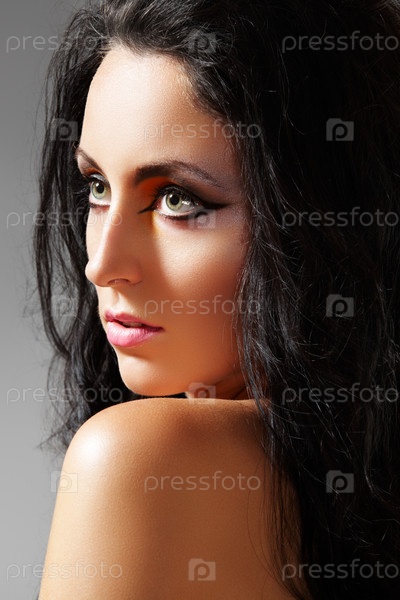 Портрет темноволосой девушки на сером фоне