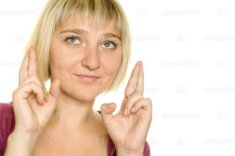 Женщина со скрещенными пальцами на белом фоне