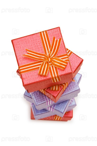 Стопка коробок с подарками на белом фоне