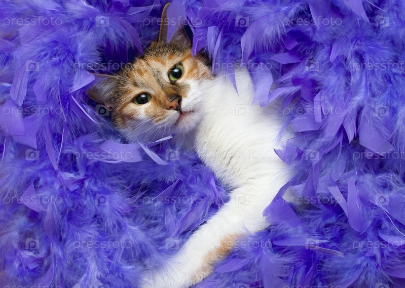 Кот среди фиолетовых перьев крупным планом