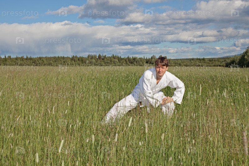 Каратист тренируется в поле