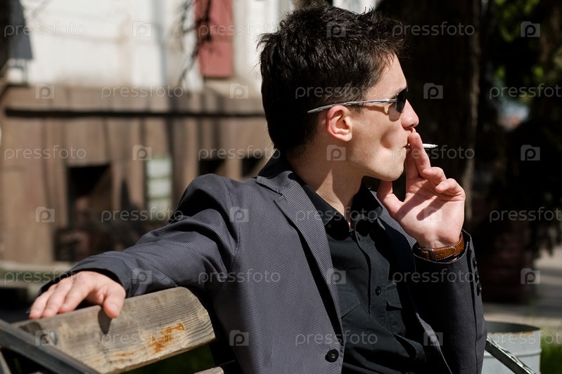 Стильный молодой человек курит, сидя на скамейке