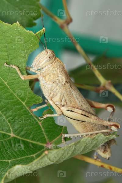 Саранча ест виноградные листья крупным планом