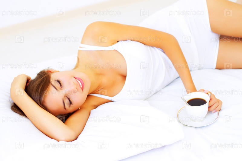Красивая девушка пьет кофе, лежа в постели