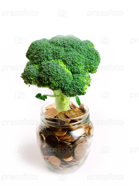 Зеленое растение в стеклянной банке и российские монеты