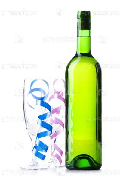 Бутылка вина и стакан с стримером на белом