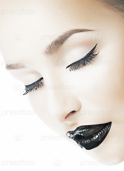 Мечтательность. Женственность. Мечтательное женское лицо с закрытыми глазами. Блестящие черные губы