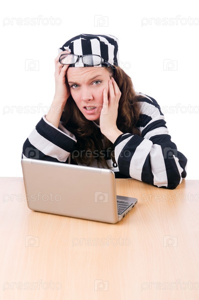 Хакер с ноутбуком на белом фоне