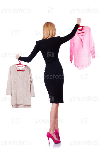 Женщина пытается выбрать одежду на белом фоне