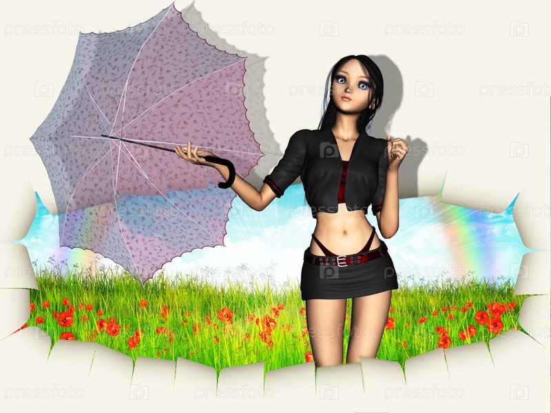 Женщина с зонтом выходит из стены
